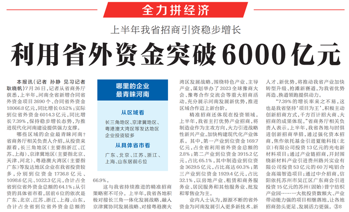 7月26日,记者从省商务厅获悉,上半年,河南全省新增合同省外资金项目2690个、合同省外资金18066.8亿元,同比增长0.52%;实际到位省外资金6014.3亿元,同比增长7.39%,保持稳步增长态势,为推进现代化河南建设提供强力支撑。(今日《河南日报》2版)