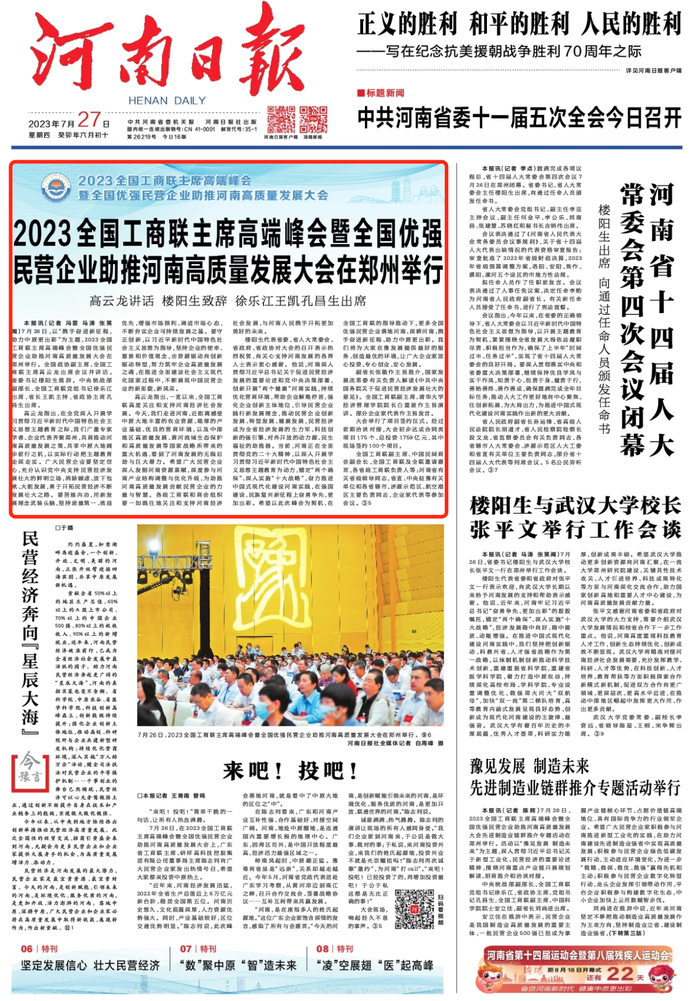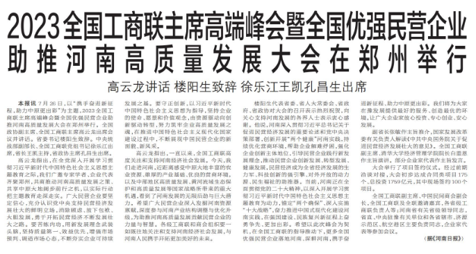 7月26日,以“携手奋进新征程,助力中原更出彩”为主题,2023全国工商联主席高端峰会暨全国优强民营企业助推河南高质量发展大会在郑州举行。全国政协副主席、全国工商联主席高云龙出席会议并讲话。省委书记楼阳生致辞。中央统战部副部长、全国工商联党组书记徐乐江出席,省长王凯主持,省政协主席孔昌生出席。(今日《郑州日报》1版)