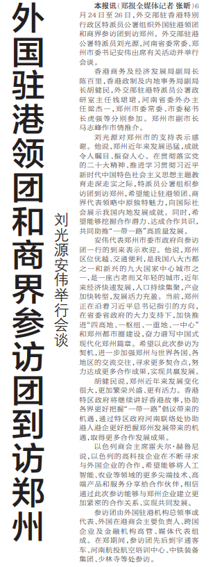 6月24日至26日,外交部驻香港特别行政区特派员公署组织外国驻港领团和商界参访团到访郑州。外交部驻港公署特派员刘光源,河南省委常委、郑州市委书记安伟出席有关活动并举行会谈。(今日《郑州日报》1版)