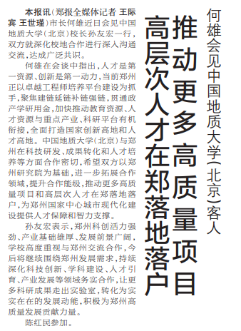 市长何雄近日会见中国地质大学(北京)校长孙友宏一行,双方就深化校地合作进行深入沟通交流,达成广泛共识。