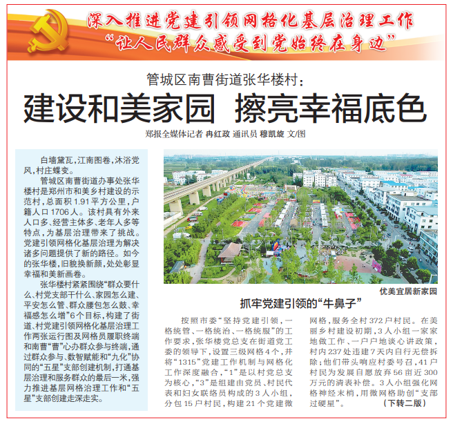 管城区南曹街道办事处张华楼村是郑州市和美乡村建设的示范村,总面积1.91平方公里,户籍人口1706人。该村具有外来人口多、经营主体多、老年人多等特点,为基层治理带来了挑战。党建引领网格化基层治理为解决诸多问题提供了新的路径。如今的张华楼,旧貌换新颜,处处彰显幸福和美新画卷。(今日《郑州日报》1版、2版)