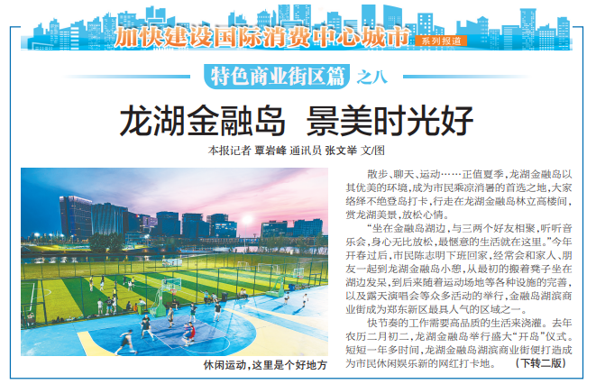 散步、聊天、运动……正值夏季,龙湖金融岛以其优美的环境,成为市民乘凉消暑的首选之地,大家络绎不绝登岛打卡,行走在龙湖金融岛林立高楼间,赏龙湖美景,放松心情。(今日《郑州日报》1版、2版)