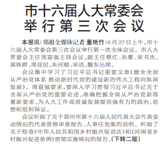 6月27日上午,市十六届人大常委会第三次会议举行第一次全体会议。市人大常委会主任周富强主持会议,副主任蔡红、孙黎、宋书杰、蒿铁群、周亚民、朱河顺、宋洁、魏东出席。(今日《郑州日报》1版、2版)