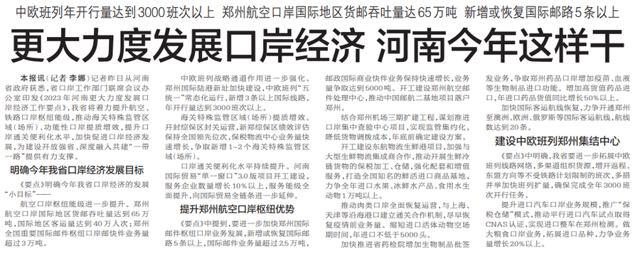 记者昨日从河南省政府获悉,省口岸工作部门联席会议办公室印发《2023年河南更大力度发展口岸经济工作要点》,我省将着力提升航空、铁路口岸枢纽能级,推动海关特殊监管区域(场所)、功能性口岸提质增效,提升口岸通关便利化水平,加快促进口岸经济发展,为建设开放强省、深度融入共建“一带一路”提供有力支撑。(今日《郑州日报》2版)