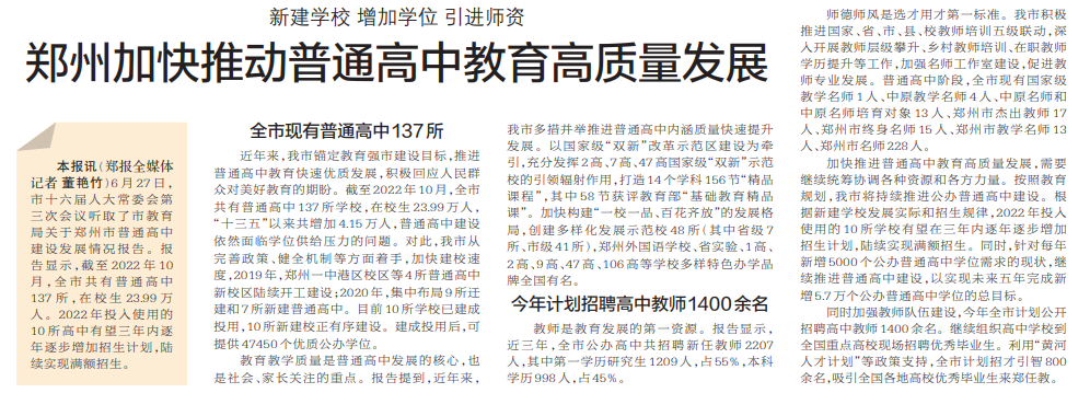 6月27日,市十六届人大常委会第三次会议听取了市教育局关于郑州市普通高中建设发展情况报告。报告显示,截至2022年10月,全市共有普通高中137所,在校生23.99万人。2022年投入使用的10所高中有望三年内逐年逐步增加招生计划,陆续实现满额招生。(今日《郑州日报》2版)