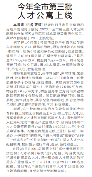 记者昨日从市住房保障和房地产管理局了解到,2023年全市第三批人才公寓配租包含沁河苑3号院和郑地紫辰美寓两个项目,共859套房源于28日上线配租。(今日《郑州日报》2版)