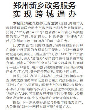 近日,郑州市大数据管理局联合新乡市政务服务和大数据管理局,实现了“郑好办”APP与“放新办”APP部分高频应用的互认互通、异地通办。这也是继 “汴捷办”之后,“郑州都市圈一网通办”的再一次扩大。(今日《郑州日报》2版)