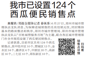 6月27日,郑州市城市管理执法支队消息,为保障进城销售的瓜农经销无忧,同时维持基本的路面整洁和秩序,郑州市城市管理局、郑州市城市管理执法支队以“百姓城管服务百姓”为主题,联合各区城市管理部门在全市规范设置了西瓜便民销售点。(今日《郑州日报》8版)