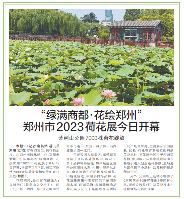 浮香绕棠邑,荷花映池杉。由郑州市园林局主办、郑州市紫荆山公园承办的“绿满商都· 花绘郑州”2023年荷花展于6月28日开幕,持续至7月7日,市民可欣赏7000余株荷花竞相绽放的夏日美景。(今日《郑州日报》8版)