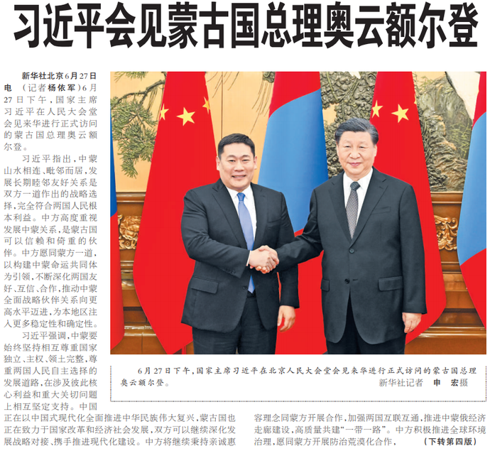习近平指出,中蒙山水相连、毗邻而居,发展长期睦邻友好关系是双方一道作出的战略选择,完全符合两国人民根本利益。中方高度重视发展中蒙关系,是蒙古国可以信赖和倚重的伙伴。中方愿同蒙方一道,以构建中蒙命运共同体为引领,不断深化两国友好、互信、合作,推动中蒙全面战略伙伴关系向更高水平迈进,为本地区注入更多稳定性和确定性。(今日《人民日报》1版、4版)