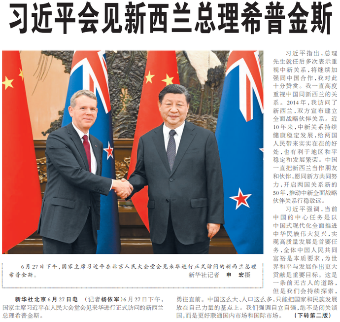 6月27日下午,国家主席习近平在人民大会堂会见来华进行正式访问的新西兰总理希普金斯。