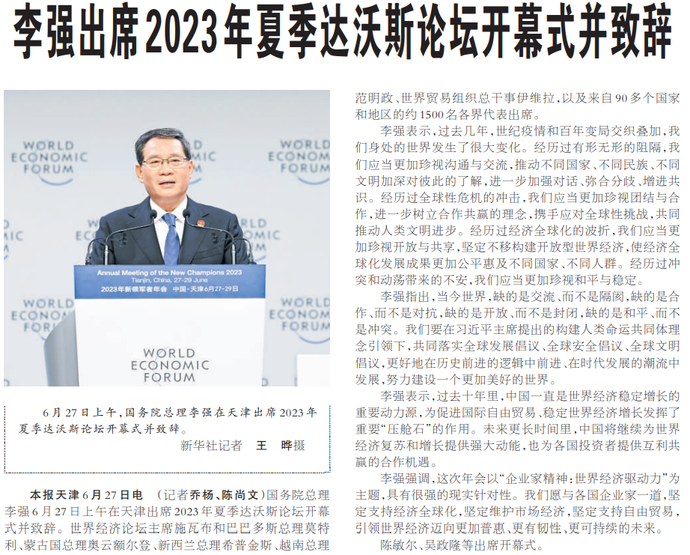 国务院总理李强6月27日上午在天津出席2023年夏季达沃斯论坛开幕式并致辞。世界经济论坛主席施瓦布和巴巴多斯总理莫特利、蒙古国总理奥云额尔登、新西兰总理希普金斯、越南总理范明政、世界贸易组织总干事伊维拉,以及来自90多个国家和地区的约1500名各界代表出席。(今日《人民日报》2版)
