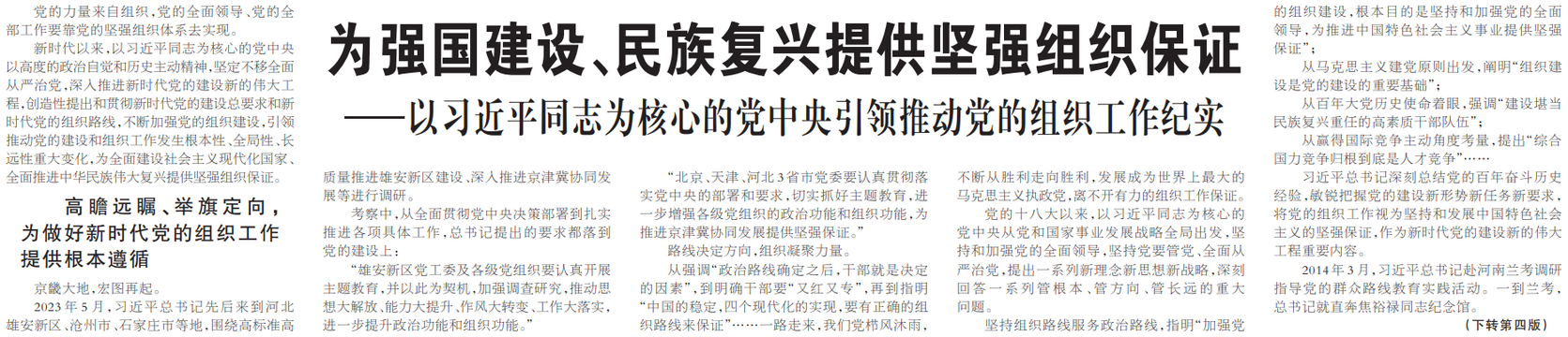 新时代以来,以习近平同志为核心的党中央以高度的政治自觉和历史主动精神,坚定不移全面从严治党,深入推进新时代党的建设新的伟大工程,创造性提出和贯彻新时代党的建设总要求和新时代党的组织路线,不断加强党的组织建设,引领推动党的建设和组织工作发生根本性、全局性、长远性重大变化,为全面建设社会主义现代化国家、全面推进中华民族伟大复兴提供坚强组织保证。(今日《人民日报》1版、4版)