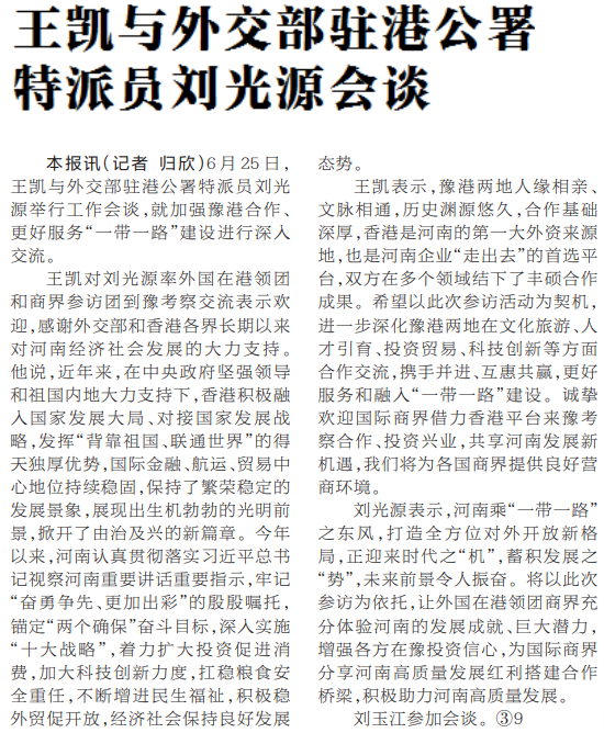 6月25日,王凯与外交部驻港公署特派员刘光源举行工作会谈,就加强豫港合作、更好服务“一带一路”建设进行深入交流。(今日《河南日报》1版)