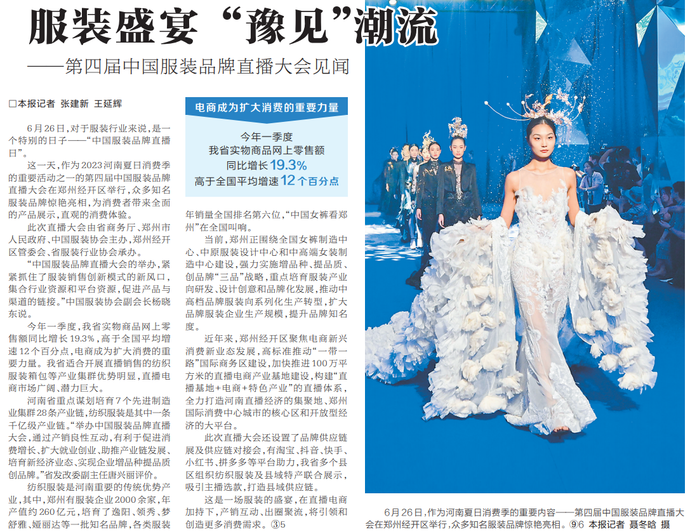这一天,作为2023河南夏日消费季的重要活动之一的第四届中国服装品牌直播大会在郑州经开区举行,众多知名服装品牌惊艳亮相,为消费者带来全面的产品展示,直观的消费体验。(今日《河南日报》4版)