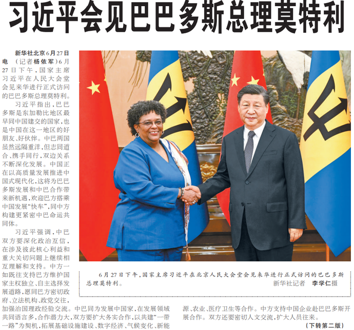 6月27日下午,国家主席习近平在人民大会堂会见来华进行正式访问的巴巴多斯总理莫特利。