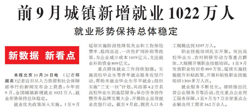 记者近日从人力资源和社会保障部举行的新闻发布会上获悉:今年前9月,全国城镇新增就业1022万人,就业形势保持总体稳定。(今日《人民日报》1版)