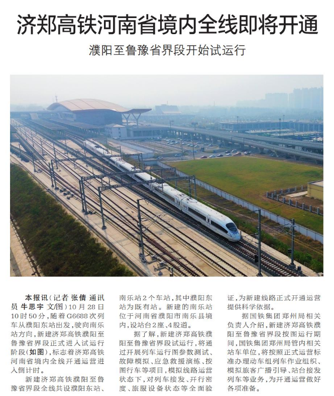 10月28日10时50分,随着G6688次列车从濮阳东站出发,驶向南乐站方向,新建济郑高铁濮阳至鲁豫省界段正式进入试运行阶段,标志着济郑高铁河南省境内全线开通运营进入倒计时。(今日《郑州日报》1版)