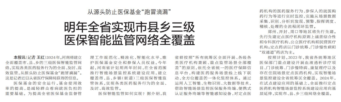 2024年,河南将建立全面覆盖市、县、乡的三级医保智能监管网络,实现各类医药服务行为的全面、及时、高效监管,从源头防止医保基金“跑冒滴漏”。这是记者近日从省医疗保障局获得的信息。(今日《郑州日报》2版)