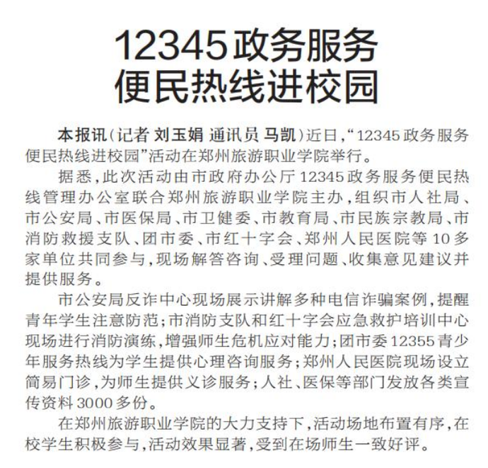近日,“12345政务服务便民热线进校园”活动在郑州旅游职业学院举行。(今日《郑州日报》2版)