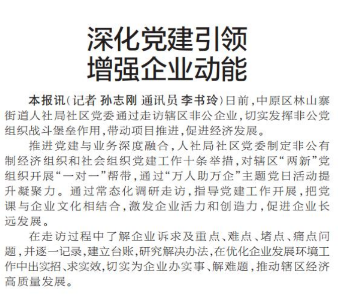 日前,中原区林山寨街道人社局社区党委通过走访辖区非公企业,切实发挥非公党组织战斗堡垒作用,带动项目推进,促进经济发展。(今日《郑州日报》2版)