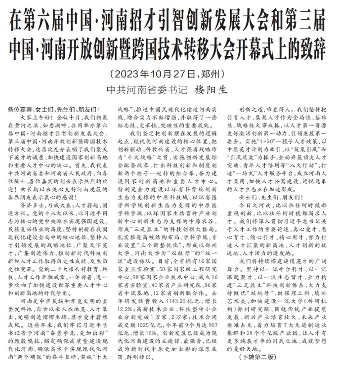 在第六届中国·河南招才引智创新发展大会和第三届中国·河南开放创新暨跨国技术转移大会开幕式上的致辞