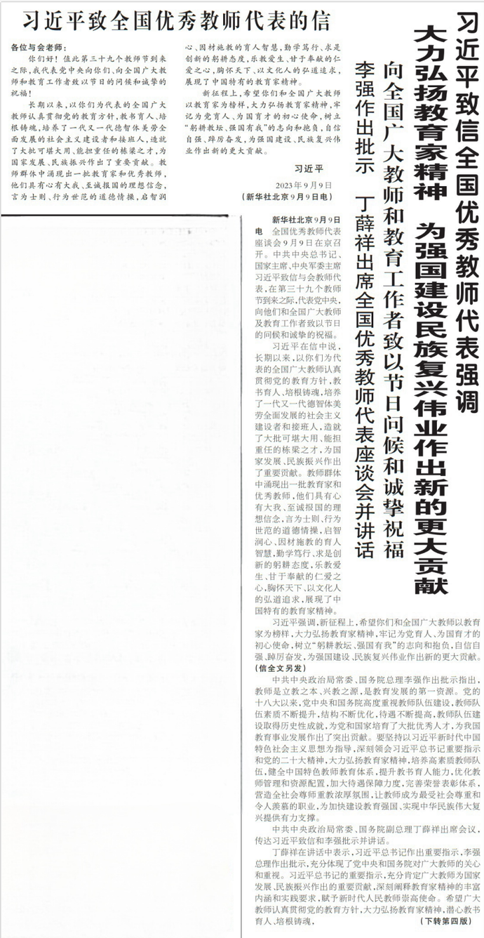全国优秀教师代表座谈会9月9日在京召开。中共中央总书记、国家主席、中央军委主席习近平致信与会教师代表,在第三十九个教师节到来之际,代表党中央,向他们和全国广大教师及教育工作者致以节日的问候和诚挚的祝福。(今日《人民日报》1版、4版)