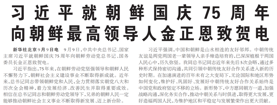 9月9日,中共中央总书记、国家主席习近平就朝鲜国庆75周年向朝鲜劳动党总书记、国务委员长金正恩致贺电。(今日《人民日报》1版)