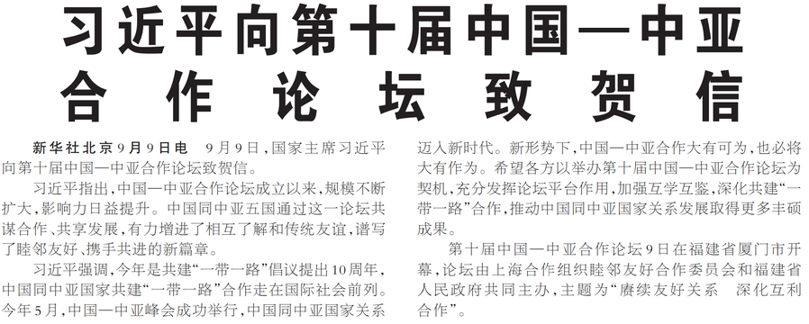 9月9日,国家主席习近平向第十届中国—中亚合作论坛致贺信。(今日《人民日报》1版)