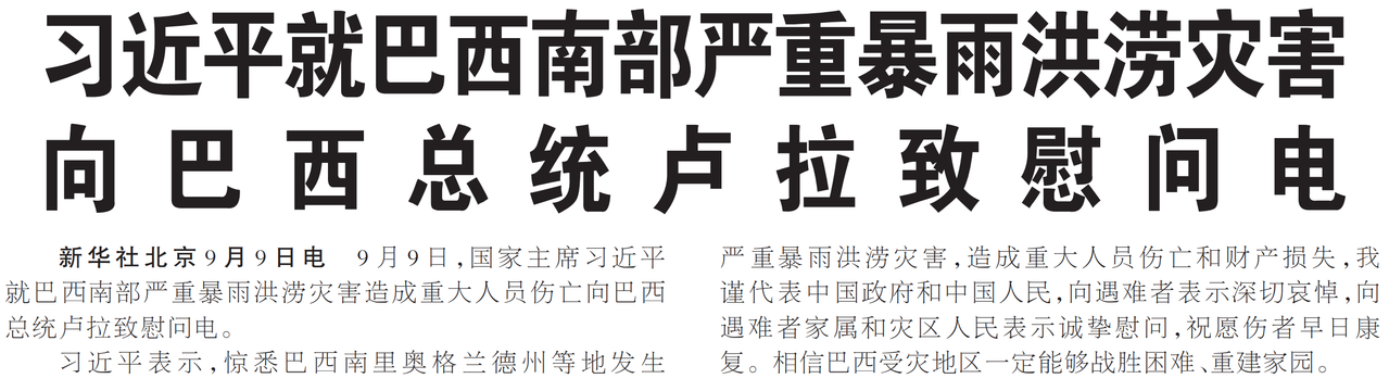 9月9日,国家主席习近平就巴西南部严重暴雨洪涝灾害造成重大人员伤亡向巴西总统卢拉致慰问电。(今日《人民日报》1版)