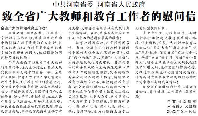 金秋九月,硕果盈枝。值此第39个教师节来临之际,省委和省政府向辛勤耕耘在教育战线的广大教师、教育工作者,以及为教育事业发展作出贡献的离退休老同志,致以诚挚的问候和节日的祝福!(今日《河南日报》1版)
