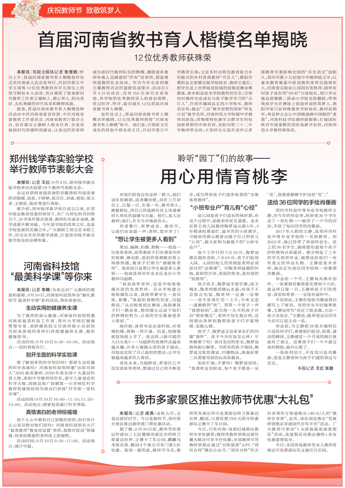 金秋九月,正是出游好时节。今日是教师节,郑州部分景区推出谢师恩门票优惠活动。(今日《郑州日报》2版)