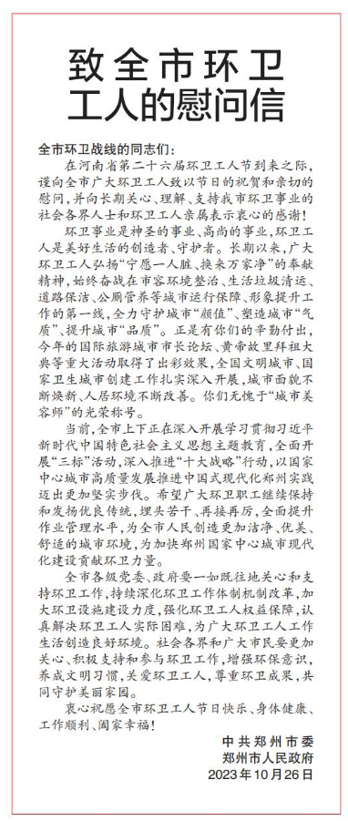 在河南省第二十六届环卫工人节到来之际,谨向全市广大环卫工人致以节日的祝贺和亲切的慰问,并向长期关心、理解、支持我市环卫事业的社会各界人士和环卫工人亲属表示衷心的感谢!(今日《郑州日报》1版)