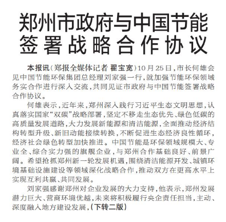 10月25日,市长何雄会见中国节能环保集团总经理刘家强一行,就加强节能环保领域务实合作进行深入交流,共同见证市政府与中国节能签署战略合作协议。(今日《郑州日报》1版、2版)