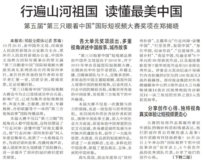 10月25日,由中国外文局、河南省人民政府新闻办公室联合主办,郑州市人民政府新闻办公室、中国外文局煦方国际传媒承办的第五届“第三只眼看中国”国际短视频大赛颁奖典礼系列活动在河南郑州举行,来自世界各地的创作者和专家学者汇聚一堂,切磋交流,碰撞思想,见证荣耀时刻。(今日《郑州日报》1版、2版)