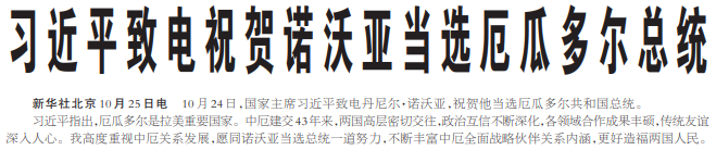 10月24日,国家主席习近平致电丹尼尔·诺沃亚,祝贺他当选厄瓜多尔共和国总统。(今日《人民日报》1版)