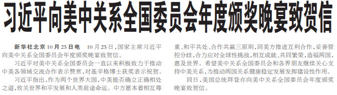 10月25日,国家主席习近平向美中关系全国委员会年度颁奖晚宴致贺信。(今日《人民日报》1版)