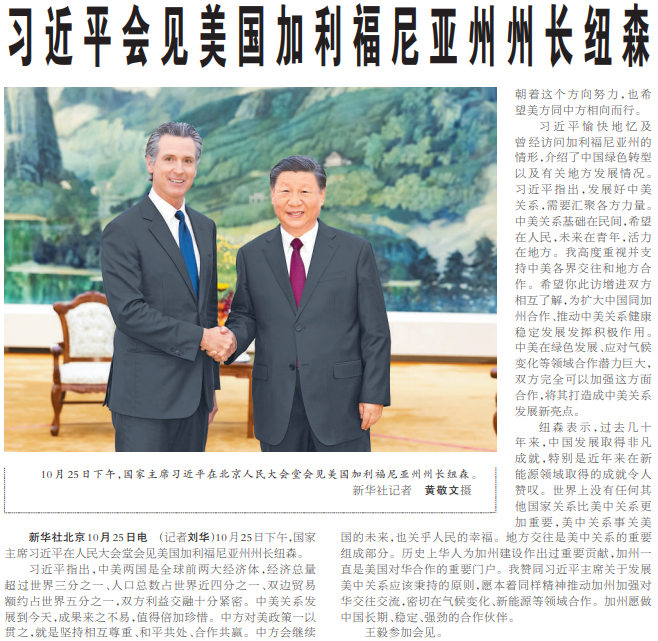 10月25日下午,国家主席习近平在人民大会堂会见美国加利福尼亚州州长纽森。(今日《人民日报》1版)