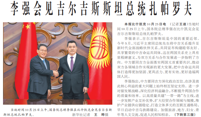 当地时间10月25日上午,国务院总理李强在比什凯克同吉尔吉斯斯坦总理扎帕罗夫会谈。(今日《人民日报》3版)