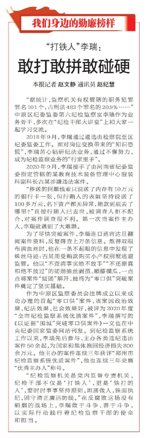 “据统计,监察机关有权管辖的职务犯罪罪名101个,占刑法483个罪名的20.9%……”中原区纪委监委第六纪检监察室李瑞作为业务骨干,多次在“纪检干部大讲堂”上和大家一起学习交流。(今日《郑州日报》6版)