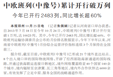 记者从河南省口岸办获悉:自2013年7月18日至今年10月24日,中欧班列(中豫号)累计开行突破1万列,达10023列。其中,今年已开行2483列,同比增长超60%。中欧班列运输协调委员会公布的月份排名数据显示,今年下半年以来,河南省中欧班列(中豫号)月份综合运营评价指标连续3个月保持在全国前三。(今日《人民日报》15版)