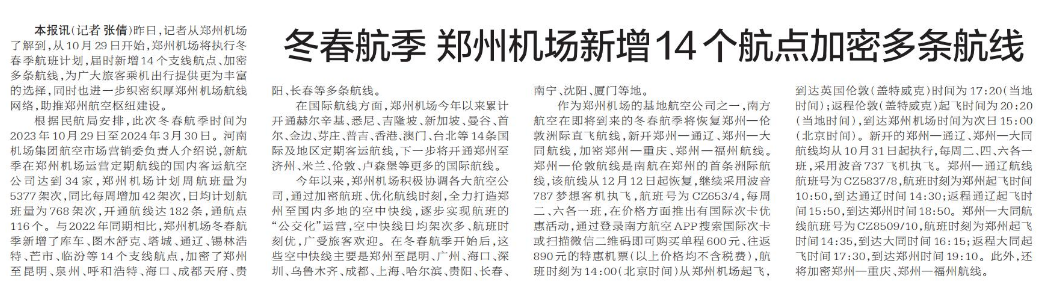 冬春航季 郑州机场新增14个航点加密多条航线