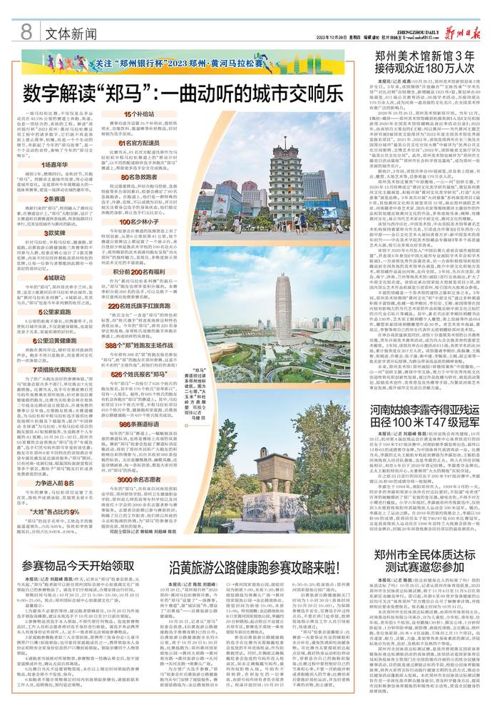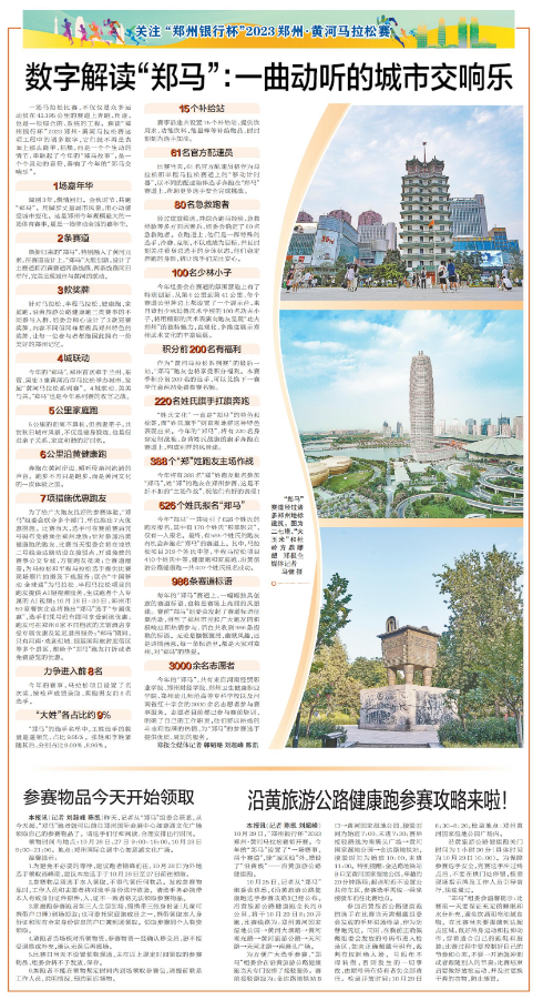 一场马拉松比赛,不仅仅是众多运动员在42.195公里的赛道上奔跑、角逐,也是一项综合的、系统的工程。解读“郑州银行杯”2023郑州·黄河马拉松赛这项工程中的诸多数字,它们就不再是表面上那么简单、枯燥,而是一个个生动的情节,串联起了今年的“郑马故事”,是一个个灵动的音符,奏响了今年的“郑马交响乐”。(今日《郑州日报》8版)