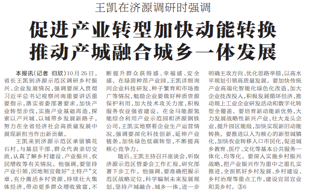 10月25日,省长王凯到济源示范区调研乡村振兴、企业发展情况,强调要深入贯彻习近平总书记视察河南重要讲话重要指示,落实省委部署要求,加快产业转型步伐,实施产业基础再造,探索以产兴城、以城带乡发展新路子,努力在全省经济社会高质量发展中展现新担当作出新贡献。(今日《河南日报》1版)