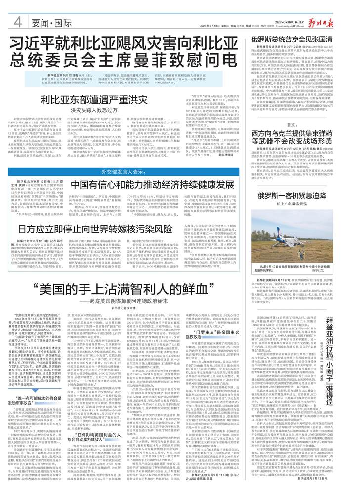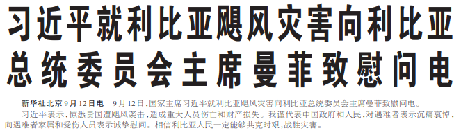 9月12日,国家主席习近平就利比亚飓风灾害向利比亚总统委员会主席曼菲致慰问电。(今日《人民日报》1版)