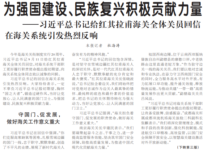 今年是海关关衔制度实行20周年,习近平总书记9月11日给红其拉甫海关全体关员回信,对海关系统干部职工更好履行职责使命提出殷切期望,向海关系统全体同志致以诚挚的问候。(今日《人民日报》1版、3版)