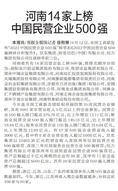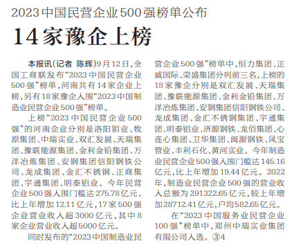 9月12日,全国工商联发布“2023中国民营企业500强”榜单,河南共有14家企业上榜,另有18家豫企入围“2023中国制造业民营企业500强”榜单。(今日《河南日报》1版)