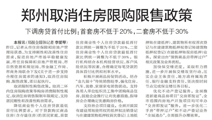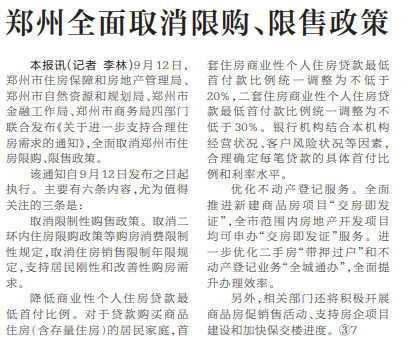 9月12日,郑州市住房保障和房地产管理局、郑州市自然资源和规划局、郑州市金融工作局、郑州市商务局四部门联合发布《关于进一步支持合理住房需求的通知》,全面取消郑州市住房限购、限售政策。(今日《河南日报》2版)