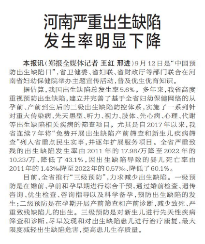 河南严重出生缺陷发生率明显下降