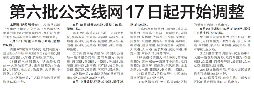 昨日,记者从郑州公交集团了解到,《郑州市公交线网服务提升方案》第六批调整线路,经广泛征求并充分结合市民意见建议后,即将调整。(今日《郑州日报》5版)